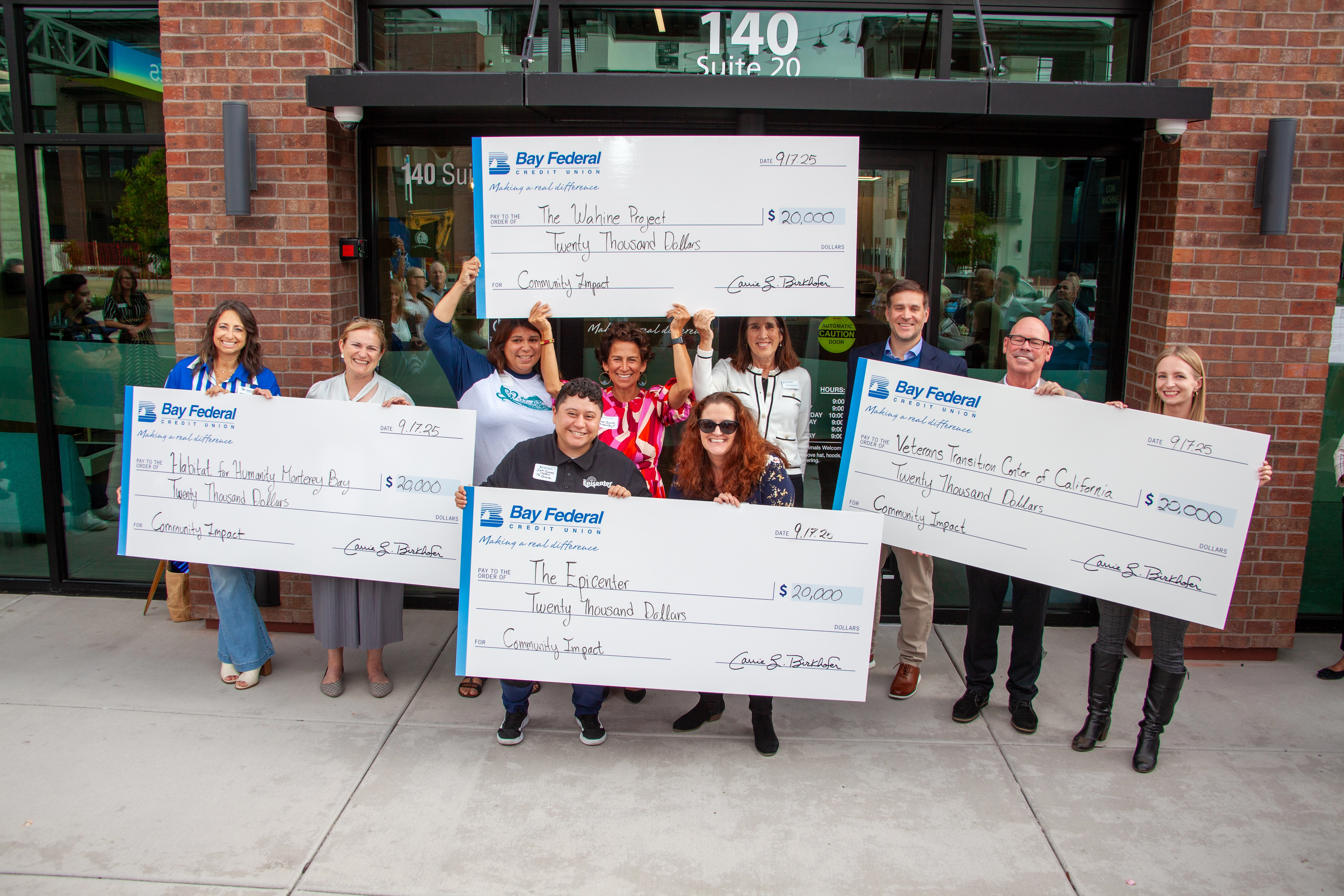 Marina, CA – September 25, 2025 - Bay Federal Credit Union celebrated the grand opening of its new Marina branch with a ribbon-cutting ceremony, marking the occasion by presenting $80,000 in donations to four nonprofits strengthening the Central Coast community. The Credit Union awarded $20,000 each to The Epicenter, Habitat for Humanity Monterey Bay, Veterans Transition Center of California, and The Wahine Project, supporting their ongoing work to create opportunity, stability, and connection for local residents.
